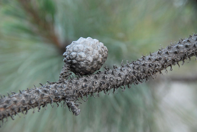 Thin peduncles on Pinus luzmariae and thin, smooth branches instead of the thick