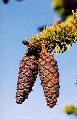 The cones of the northern variant are larger and heavier than the southern variant and have stiffer scales..
