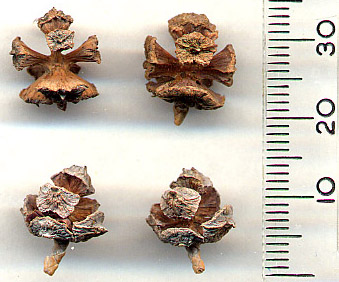 ¤ Chamaecyparis obtusa (Siebold & Zuccarini) Endlicher - Cones cult. UK Top left : cone of cv. 'Lycopodioides', showing spiral scale arrangement. (M. P. Frankіs) |
